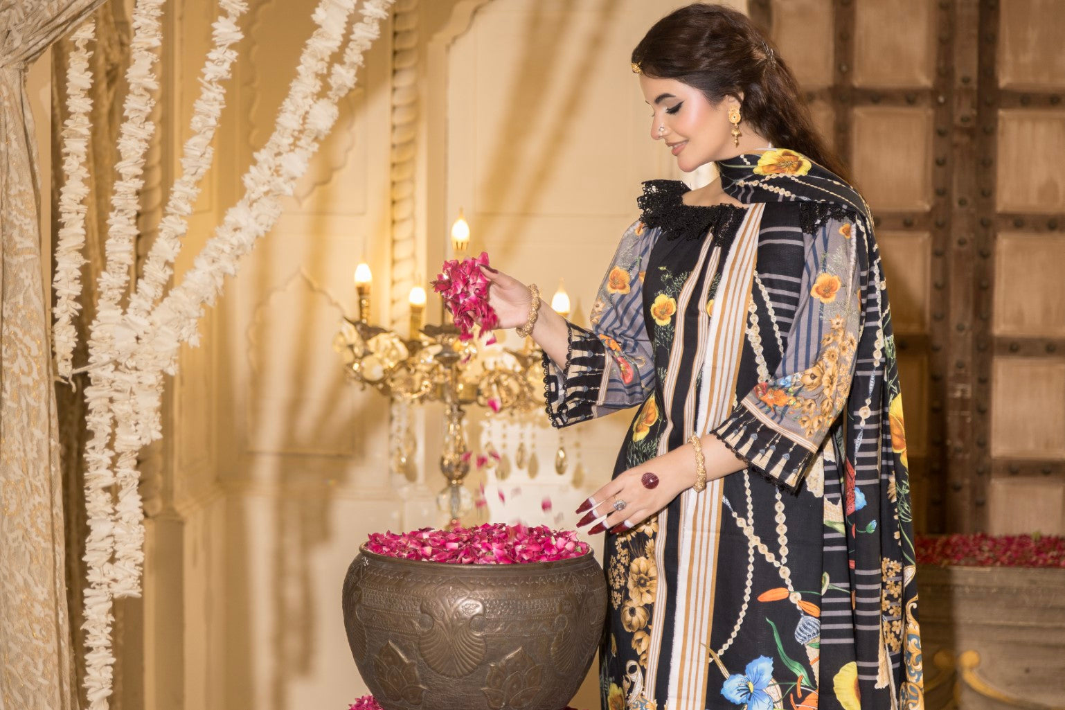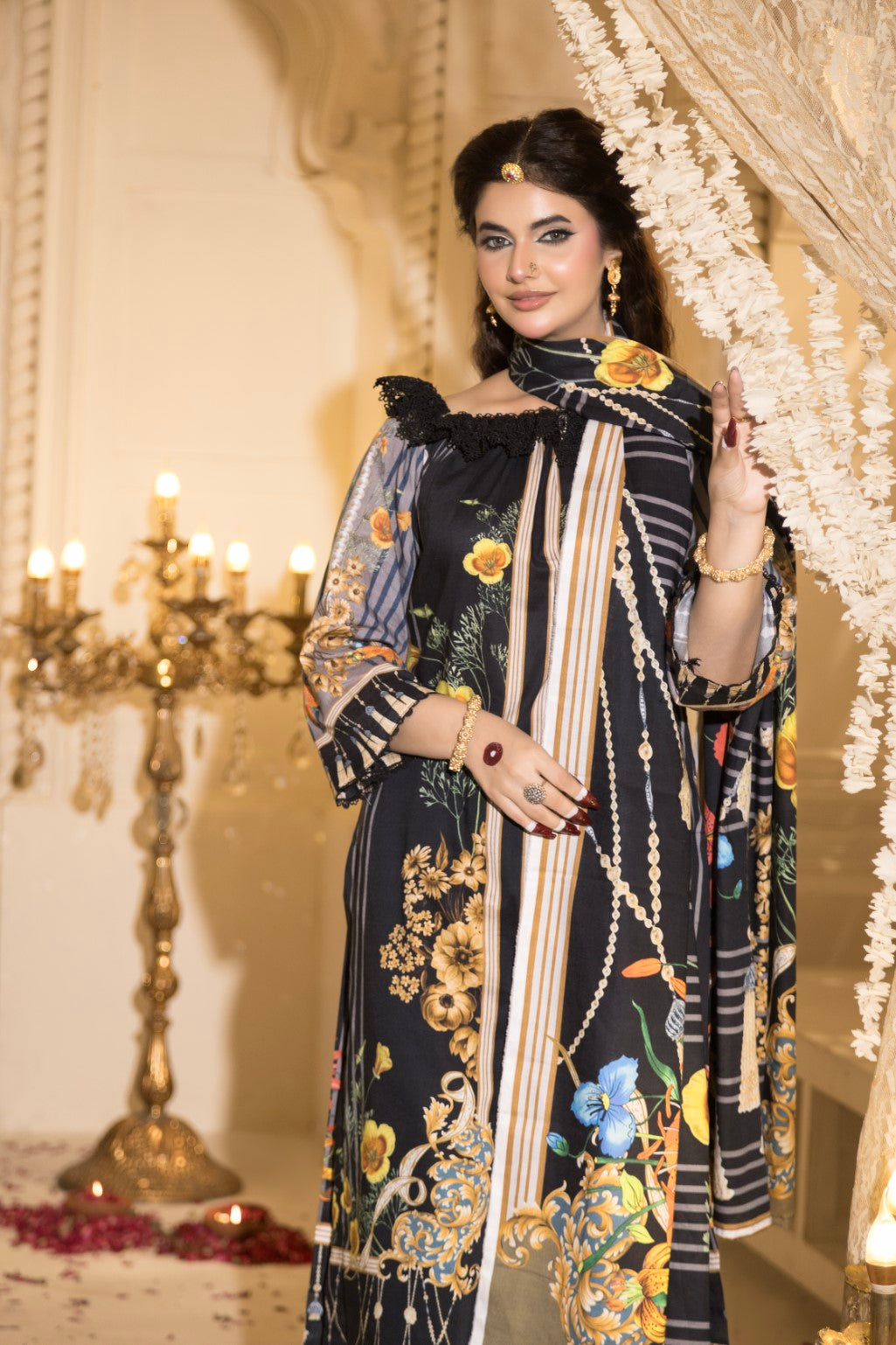 The model is wearing an elegant traditional ensemble featuring a deep navy base adorned with vibrant floral and ornamental prints in yellow, green, and blue. The shirt showcases intricate embroidery-inspired patterns on the front and sleeves, paired with straight trousers and a beautifully coordinated dupatta enriched with bold floral motifs and artistic detailing. Styled with delicate gold jewelry, including earrings, bangles, and a traditional tikka, the look exudes grace and sophistication. The backdrop of a grand archway, antique candelabras, rose petals, and ornate vessels enhances the regal, festive charm of the attire, making it perfect for formal occasions and cultural celebrations.